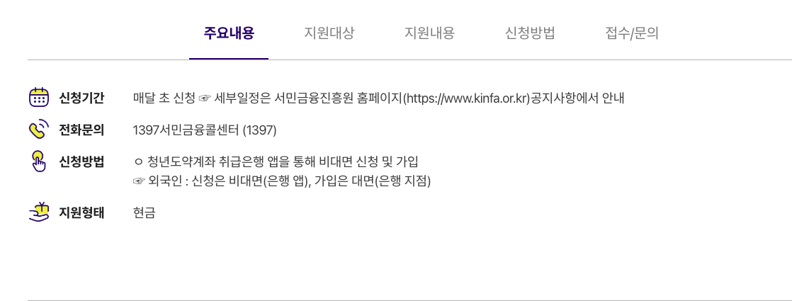 5년간 매월 최대 70만 원을 납입하면 최대 5,000만 원을 만들 수 있는 청년 지원 정책상품입니다.